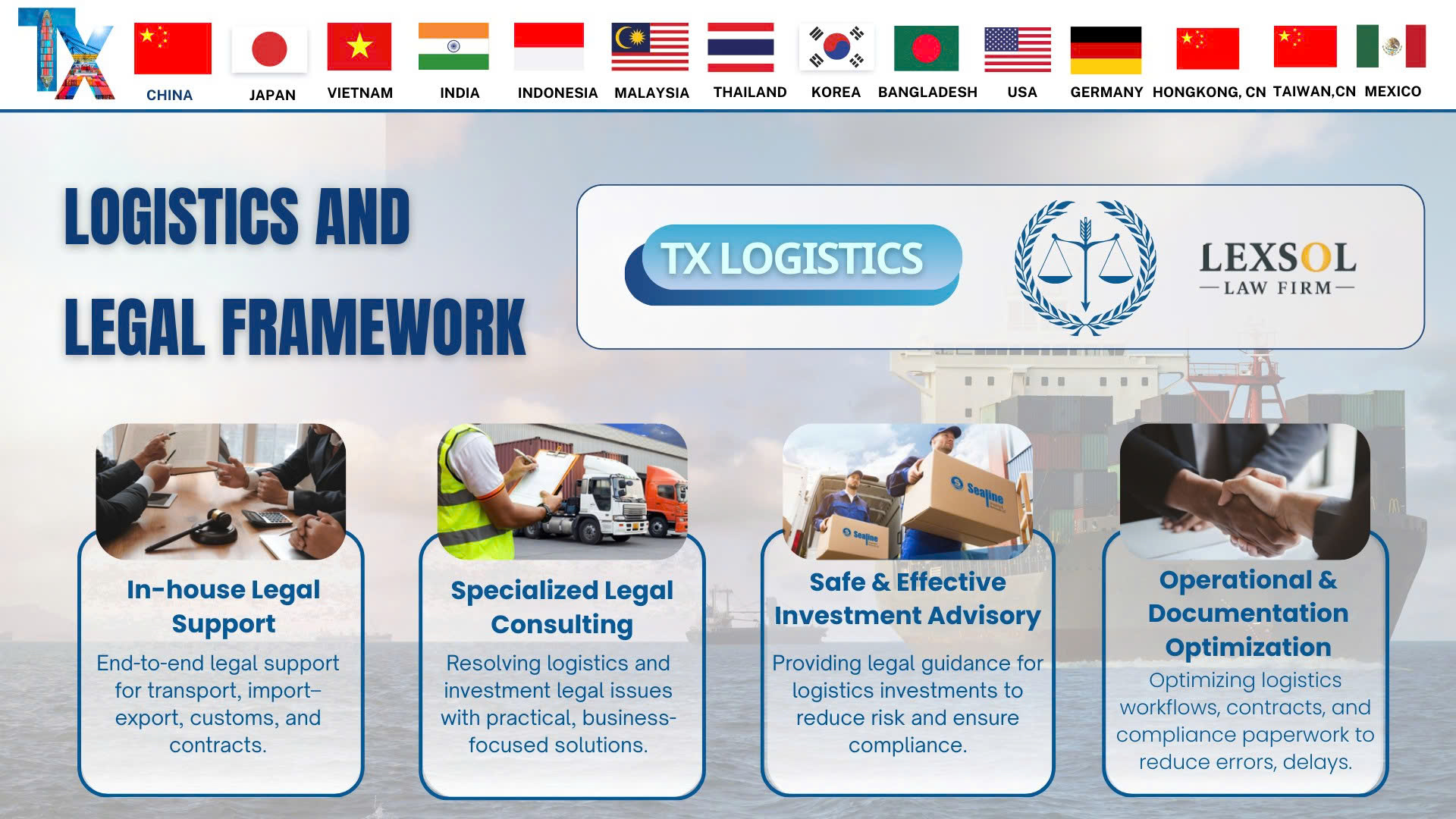 Hợp tác giữa Lexsol - TX Logistics mang lại lợi ích thiết thực cho các nhà đầu tư nước ngoài khi thành lập doanh nghiệp tại Việt Nam, Lexsol sẽ đồng hành pháp lý cùng khách hàng trong suốt quá trình thực hiện dự án, trong khi TX Logistics đảm bảo hoạt động logistics xuyên suốt, an toàn và hiệu quả. Sự kết hợp giữa tư vấn pháp lý và dịch vụ vận chuyển giúp kiểm soát tốt rủi ro về hợp đồng mua bán quốc tế, chứng từ thương mại, kiểm tra chuyên ngành và các yêu cầu tuân thủ theo pháp luật Việt Nam.